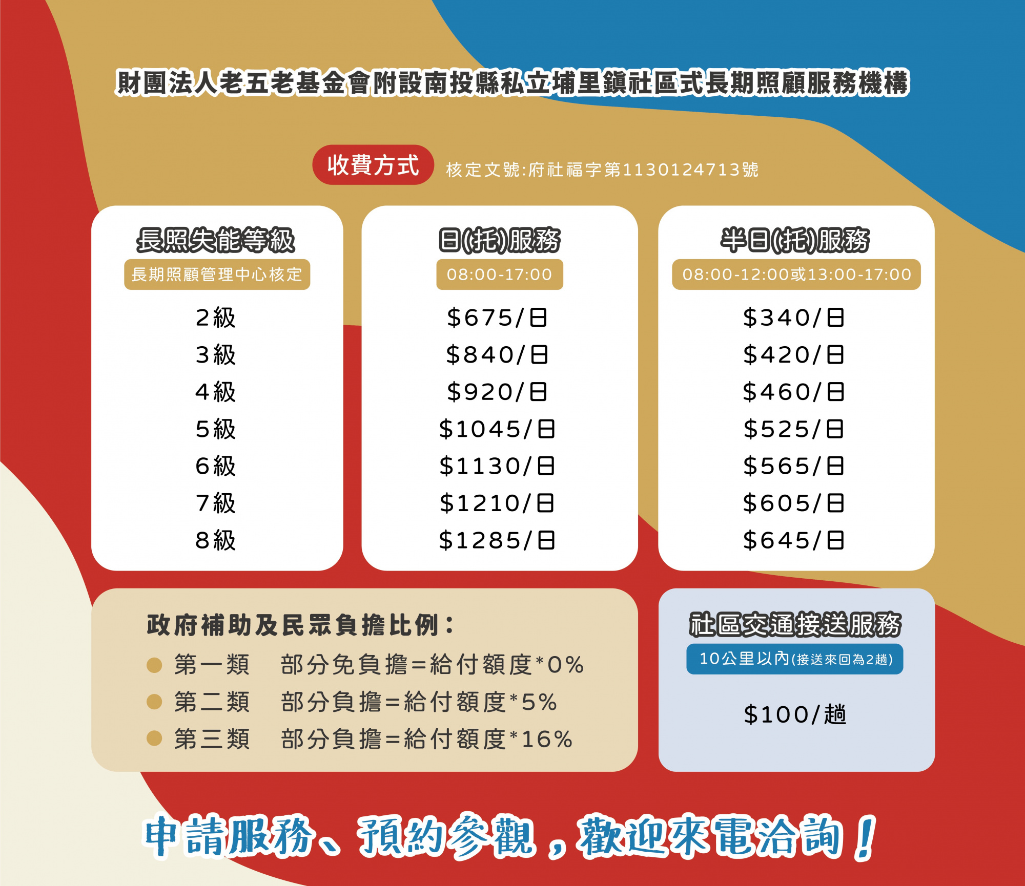 - 機構名稱:財團法人老五老基金會附設南投縣私立埔里鎮社區式長期照顧服務機構